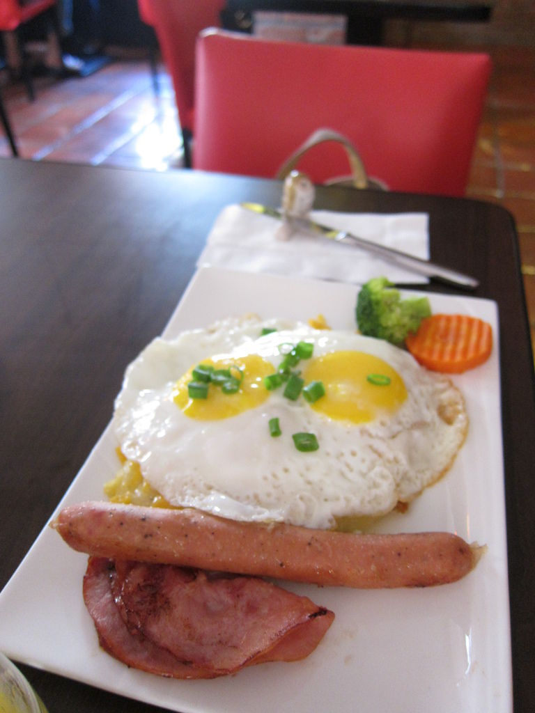 (右)南非早餐套餐,蛋底下舖的是玉米泥